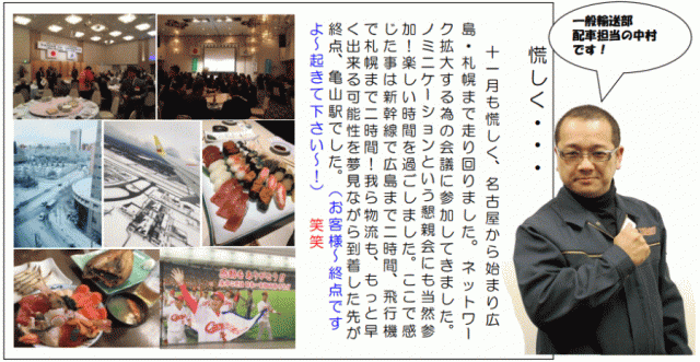 11月も慌しく、名古屋から始まり広島・札幌まで走り回りました。ネットワーク拡大する為の会議に参加してきました。